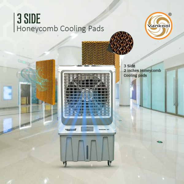 - High efficiency honeycomb pads at back side for improved evaporative cooling.